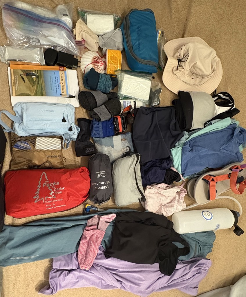 Daily medication, Pain control meds, Sunblock and chapstick, Guide book, Two pair bike shorts,One pair pants, One tank top,Two bras,Two short sleeve shirts, One long sleeve sun shirt, One thin zip jacket, 3pair undies,pajama shorts, Packa (poncho/rain cover), Silk sleeping bag liner, Towel, 2 small wash cloths, 4 pair socks, Tevas, hiking shoes, hiking poles,Sun hat, Laundry detergent sheets , 3in1 Body/face wash, Face moisturizer, Deodorant, Vaseline, Tooth brush and paste, Floss, First aid kit, Sewing kit, Safety pins, Caribiners, Nail clippers, Earphones,Nail file, Head lamp, Small bag for evenings, Passport/money holder, Ear plugs-lots, Phone/fitbit Chargers, Plug converter, Gloves , Xtra pole tips, Scallop shell, Xtra watch band, Reflector belt