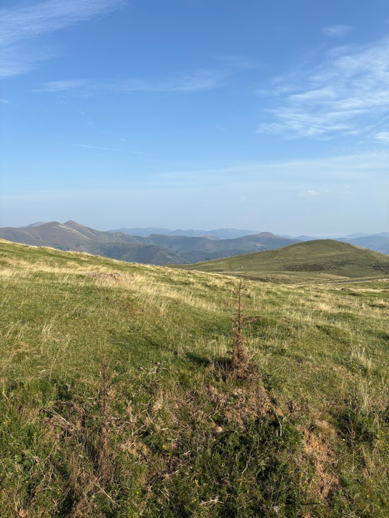 Lots of sheep and cows and Basque ponies were grazing all along the way. Also lots of “land mines” to avoid! I walked and talked for a while with Katie from Minnesota who just passed her licensure as a psychologist. We laughed that the “inner journey” of the Camino must start when our bodies get more used to all this exercise and we aren’t as focused on how difficult the walking is! Just as I got above the tree line there was a group of what looked like food trucks and utility vans and my fellow pilgrims and I believe it was a film crew…. Maybe I will be in the background of the sequel to “The Way”!